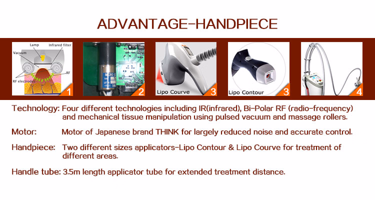 La radiofrequenza bipolare (RF) A 10 MHZ con due rulli può penetrare nello strato di 0.5-1.5 cm sotto la pelle per lavorare efficacemente sul tessuto adiposo.